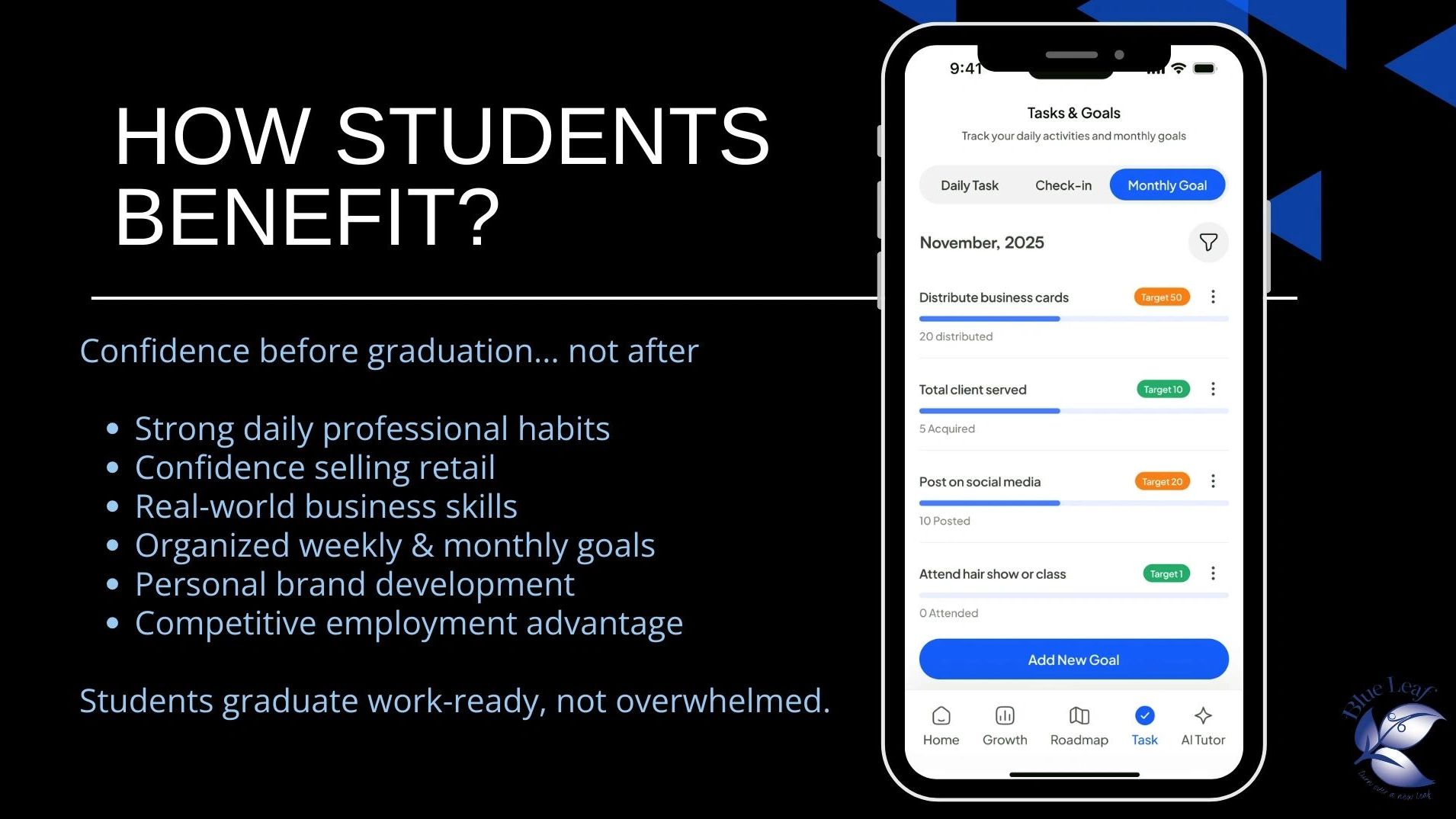 Blue Leaf Guide is a must-have career companion for cosmetology, barber, and esthetics students—combining in-person mentorship, AI-powered guidance, and real-world beauty education to support state board readiness, professionalism, and a confident transition from classroom to licensed professional.